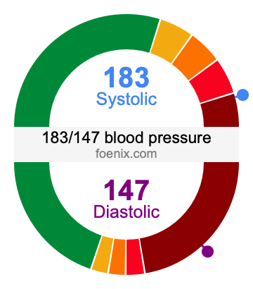 The illustration below gives a visual representation of the blood pressure 183/147 so you can better understand what it means and where it falls on the blood pressure chart.