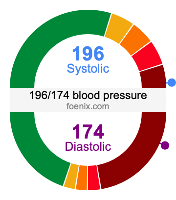 The illustration below gives a visual representation of the blood pressure 196/174 so you can better understand what it means and where it falls on the blood pressure chart.