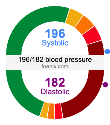 The illustration below gives a visual representation of the blood pressure 196/182 so you can better understand what it means and where it falls on the blood pressure chart.