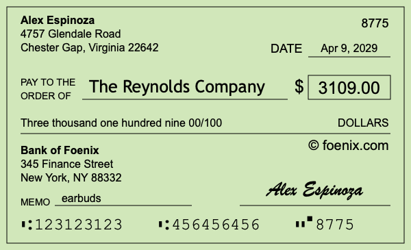 As the illustration above shows, the $3,109 check dated Apr 9, 2029 was written and signed by Alex Espinoza.