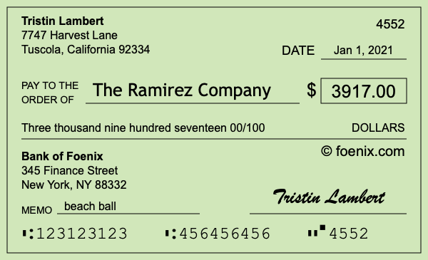 Note that you can change the "00" in 00/100 to a number if you need to add cents to $3,917. Here is an illustration of a check written out to The Ramirez Company in the amount of $3,917.