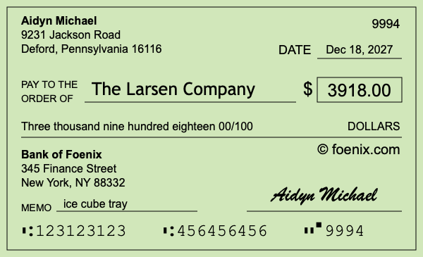 As the illustration above shows, the $3,918 check dated Dec 18, 2027 was written and signed by Aidyn Michael.