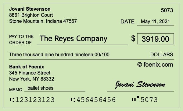Note that you can change the "00" in 00/100 to a number if you need to add cents to $3,919. Here is an illustration of a check written out to The Reyes Company in the amount of $3,919.