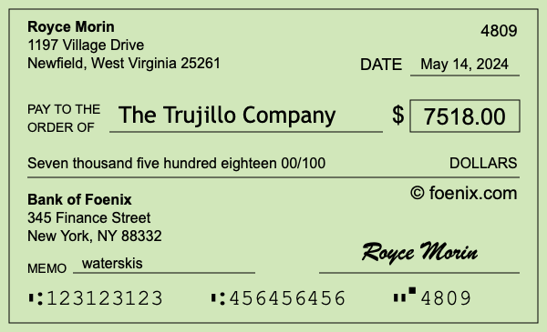 As the illustration above shows, the $7,518 check dated May 14, 2024 was written and signed by Royce Morin.