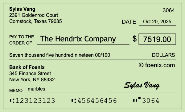 Note that you can change the "00" in 00/100 to a number if you need to add cents to $7,519. Here is an illustration of a check written out to The Hendrix Company in the amount of $7,519.