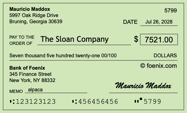 As the illustration above shows, the $7,521 check dated Jul 26, 2028 was written and signed by Mauricio Maddox.