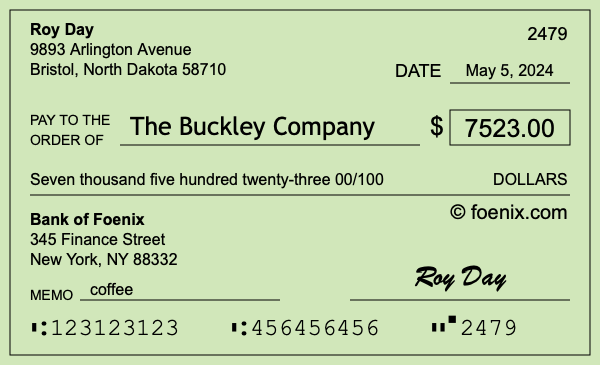 Note that you can change the "00" in 00/100 to a number if you need to add cents to $7,523. Here is an illustration of a check written out to The Buckley Company in the amount of $7,523.