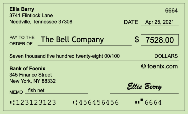 Note that you can change the "00" in 00/100 to a number if you need to add cents to $7,528. Here is an illustration of a check written out to The Bell Company in the amount of $7,528.
