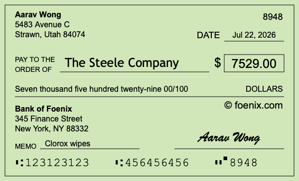 As the illustration above shows, the $7,529 check dated Jul 22, 2026 was written and signed by Aarav Wong.