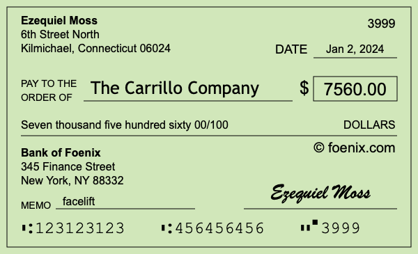 As the illustration above shows, the $7,560 check dated Jan 2, 2024 was written and signed by Ezequiel Moss.