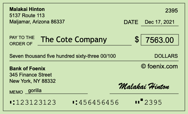 Note that you can change the "00" in 00/100 to a number if you need to add cents to $7,563. Here is an illustration of a check written out to The Cote Company in the amount of $7,563.