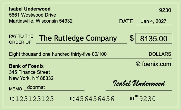 As the illustration above shows, the $8,135 check dated Jan 4, 2027 was written and signed by Isabel Underwood.