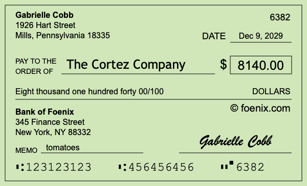 As the illustration above shows, the $8,140 check dated Dec 9, 2029 was written and signed by Gabrielle Cobb.