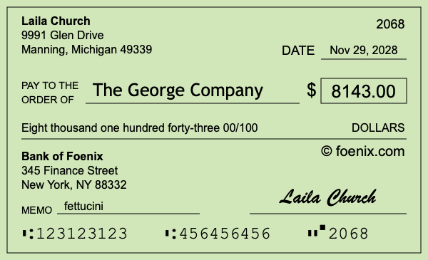 As the illustration above shows, the $8,143 check dated Nov 29, 2028 was written and signed by Laila Church.
