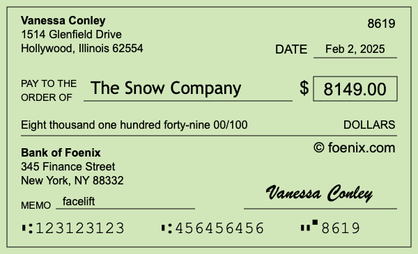Note that you can change the "00" in 00/100 to a number if you need to add cents to $8,149. Here is an illustration of a check written out to The Snow Company in the amount of $8,149.