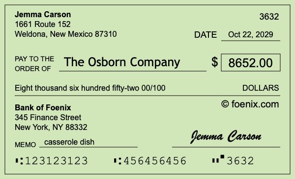 As the illustration above shows, the $8,652 check dated Oct 22, 2029 was written and signed by Jemma Carson.