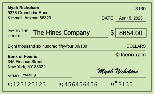 Note that you can change the "00" in 00/100 to a number if you need to add cents to $8,654. Here is an illustration of a check written out to The Hines Company in the amount of $8,654.