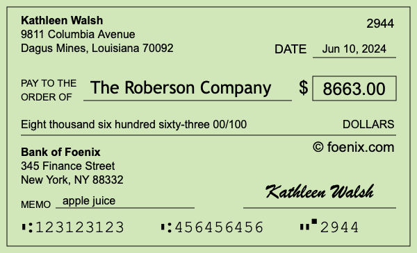 Note that you can change the "00" in 00/100 to a number if you need to add cents to $8,663. Here is an illustration of a check written out to The Roberson Company in the amount of $8,663.