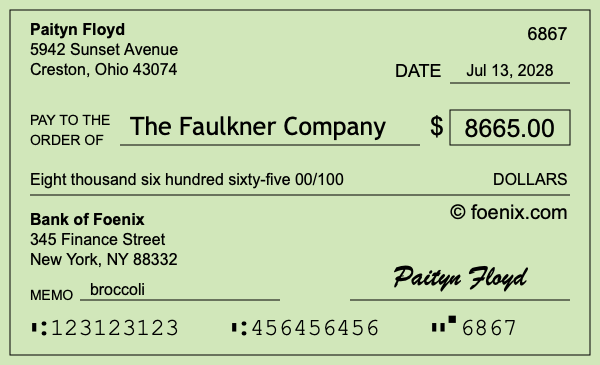 As the illustration above shows, the $8,665 check dated Jul 13, 2028 was written and signed by Paityn Floyd.