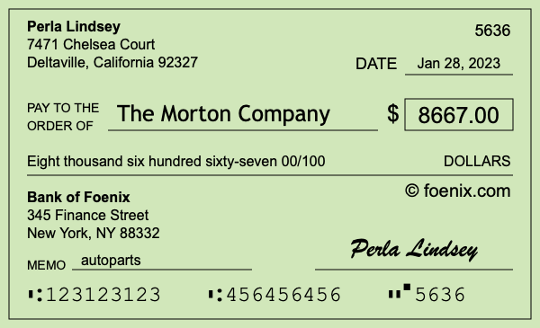 Note that you can change the "00" in 00/100 to a number if you need to add cents to $8,667. Here is an illustration of a check written out to The Morton Company in the amount of $8,667.