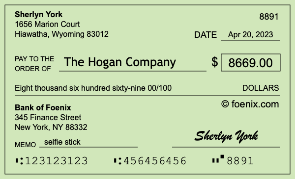 Note that you can change the "00" in 00/100 to a number if you need to add cents to $8,669. Here is an illustration of a check written out to The Hogan Company in the amount of $8,669.