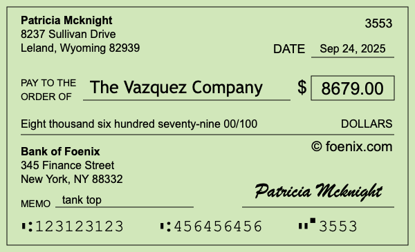 Note that you can change the "00" in 00/100 to a number if you need to add cents to $8,679. Here is an illustration of a check written out to The Vazquez Company in the amount of $8,679.