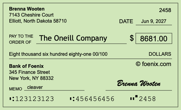 As the illustration above shows, the $8,681 check dated Jun 9, 2027 was written and signed by Brenna Wooten.