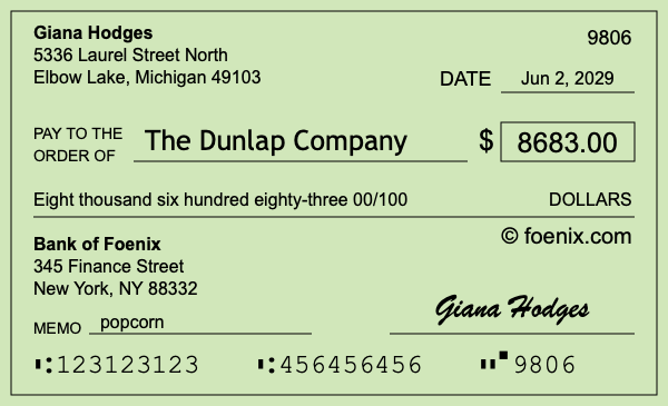 As the illustration above shows, the $8,683 check dated Jun 2, 2029 was written and signed by Giana Hodges.