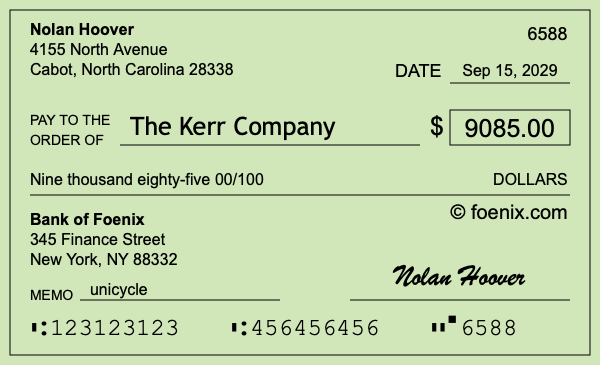 As the illustration above shows, the $9,085 check dated Sep 15, 2029 was written and signed by Nolan Hoover.