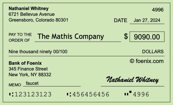 Note that you can change the "00" in 00/100 to a number if you need to add cents to $9,090. Here is an illustration of a check written out to The Mathis Company in the amount of $9,090.