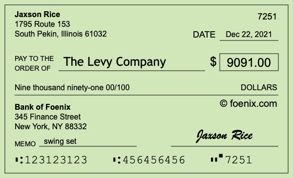 Note that you can change the "00" in 00/100 to a number if you need to add cents to $9,091. Here is an illustration of a check written out to The Levy Company in the amount of $9,091.