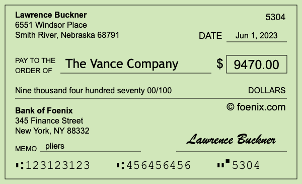 Note that you can change the "00" in 00/100 to a number if you need to add cents to $9,470. Here is an illustration of a check written out to The Vance Company in the amount of $9,470.