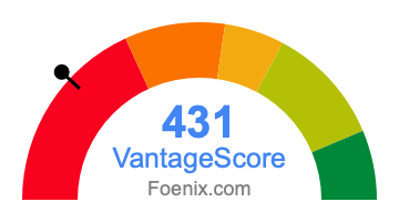 Here is a key to help you understand what each color of our VantageScore illustration represents. As you can see, a VantageScore credit score of 431 falls in the very poor category.
